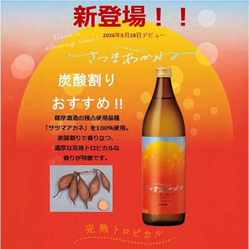 薩󠄀摩酒造株式会社は、濃厚な完熟トロピカルな香りが特徴の本格芋焼酎「さつまあかね」を新発売いたします。炭酸割りで際立つ香りをお楽しみください。また、本格芋焼酎「彩響」の爽快感あふれる美味しさを手軽にお楽しみいただける「彩響モヒート350ml缶」も新登場!モヒートスタイルの新たな飲み方をこの機会に是非ご賞味ください。様々な焼酎を取り揃え、お待ちしております!